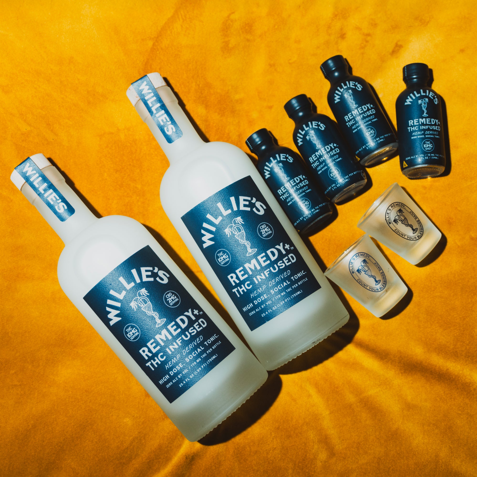 Introducing the High Road Bundle… a collection of high dose goods to help you live like a legend. This bundle contains two 10mg Bottles of Willie’s Remedy, four (free) 10mg Shots and two (free) signature shot glasses—making it perfect for sharing or stashing depending on which way the wind’s blowing.Bluer skies guaranteed.Get yours before it goes.