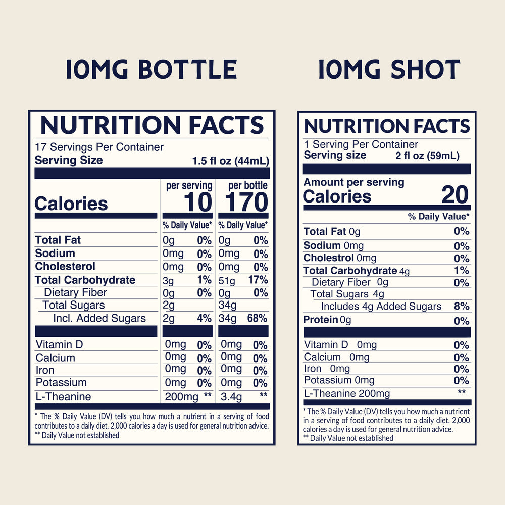 • 10mg THC, 2mg CBD, 2mg CBG, 200mg L-Theanine per shot (1.5oz)